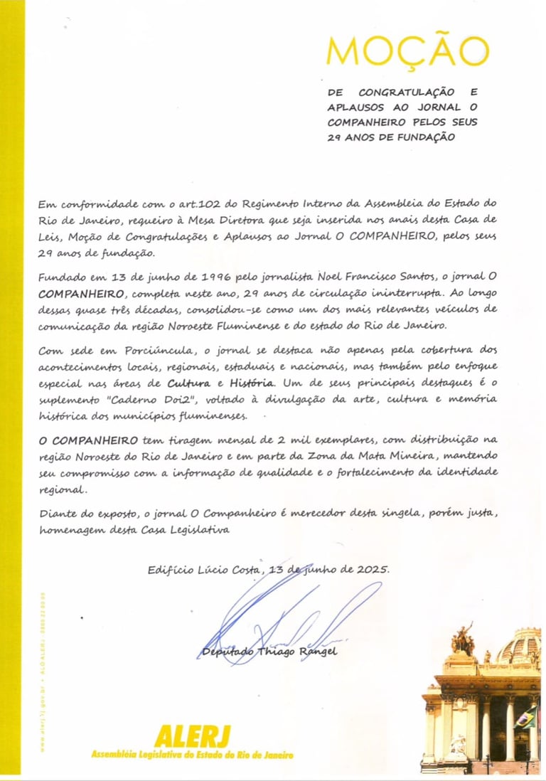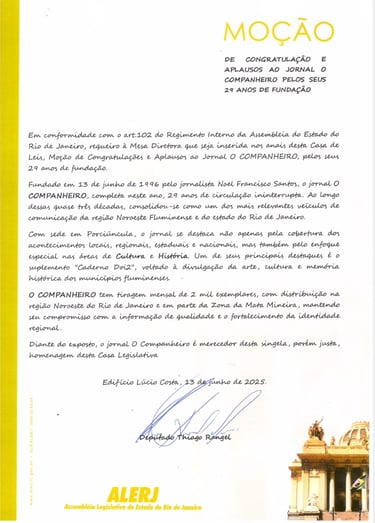 A Assembleia Legislativa do Rio de Janeiro - Alerj - aprovou na quarta-feira 11 de junho uma "Moção de Congratulações e Aplausos" ao jornal O COMPANHEIRO pelos 29 anos de circulação ininterrupta. A iniciativa é do deputado estadual Thiago Rangel (PMB).